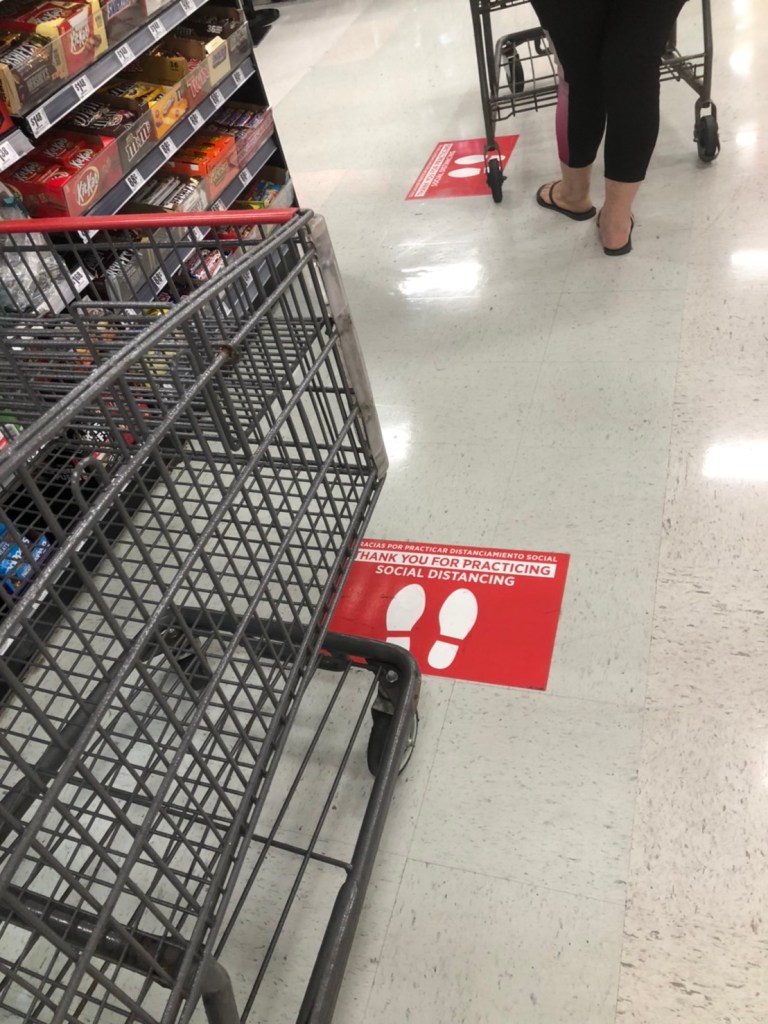 前回のブログにも書かせていただいた列に並ぶ際にあるSocial Distancing のサインがレジにも貼られるようになった時の写真です。