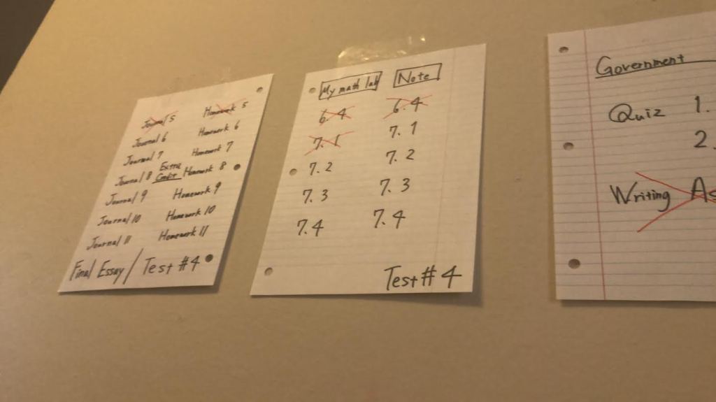 この写真は、オンライン授業になってから宿題の量が増えたので、1週間の宿題を全部書き出して壁に貼っていた時のです。