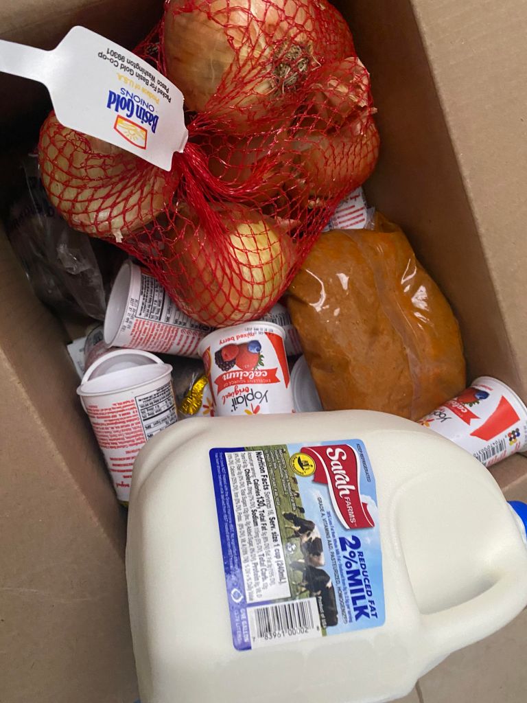この中には、牛乳、玉ねぎ、じゃがいも、ヨーグルト、パン、ハンバーガーのソース、ハンバーガーのお肉が冷凍されたまま入っていました。