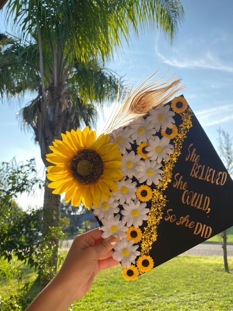 アメリカの卒業式では、このようにデコレーションした帽子をかぶるのが一般的です。